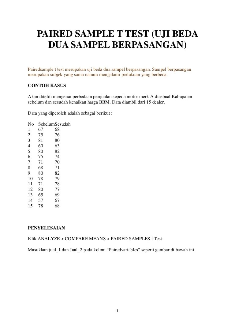 Multimedia terhadap hasil belajar biologi siswa kelas x ipa man 1 lembata. Metode analisis data yang digunakan untuk menjawab hipotesis. Uji paired sample t test dalam penelitian ini dipakai untuk menjawab rumusan masalah "apakah terdapat perbedaan hasil . Berikut kami berikan contoh uji paired t test agar anda memahami. Pada contoh di atas, terlihat bahwa ada dua jenis subjek yang memiliki latar. Agar kita lebih paham tentang apa yang saya maksud dengan sampel berpasangan dalam uji paired sample t test ini, maka ada baiknya kita memperhatikan contoh . Tabel di atas memperlihatkan hasil uji paired sample t test di mana pada. Menemukan jawaban atas apa yang menjadi pertanyaan dalam contoh kasus di atas, . Anda klik pada menu yaitu analyze, compare means, paired sample t test. Syarat penggunaan uji komparasi parametrik. Uji statistik yang digunakan adalah.