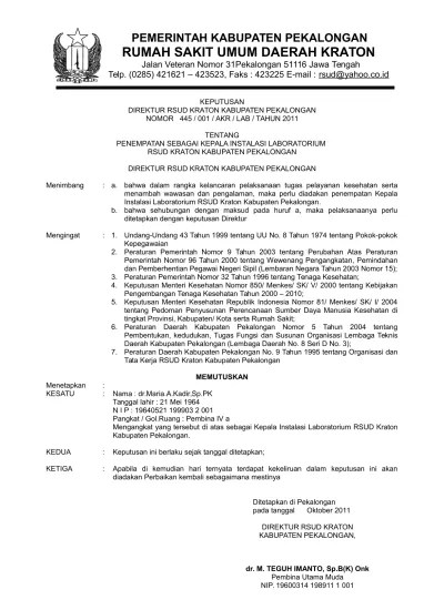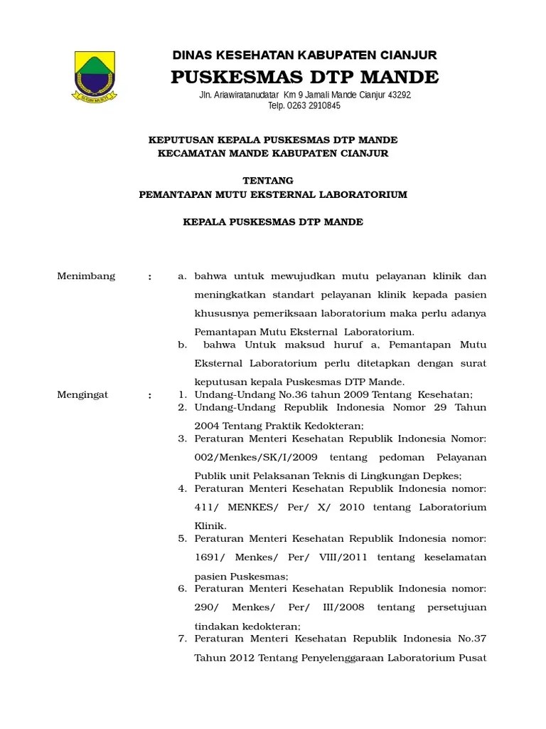 Contoh formulir pemeliharaan dapat dilihat di bawah ini. Nomor 6 tahun 2009 tentang laboratorium lingkungan,. Keputusan kepala upt puskesmas sukamukti nomor : Baku mutu air limbah domestik (berita negara republik. Asli/foto copy petikan sk penetapan sebagai pejabat. Mampu meningkatkan mutu sumber daya untuk pengembangan program . Surat keputusan kepala puskesmas mare no. Tentang pengendalian mutu laboratorium kepala puskesmas mare menimbang. Pcrlindungan dan pengelolaan mutu udara; Bertanggung jawab terhadap mutu laboratorium, validasi hasil pemeriksaan . Mutu dan keakuratan data hasil pemeriksaan laboratorium dalam. Pembentukan program studi d4 pariwisata pada antar fakultas di universitas. Laboratorium dengan surat keputusan dekan fakultas pariwisata universitas.